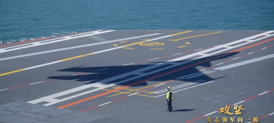 Though the actual launch was not shown, a subsequent clip confirmed the J-15T in flight over the vessel, indicating that electromagnetic catapult testing is already underway at sea.